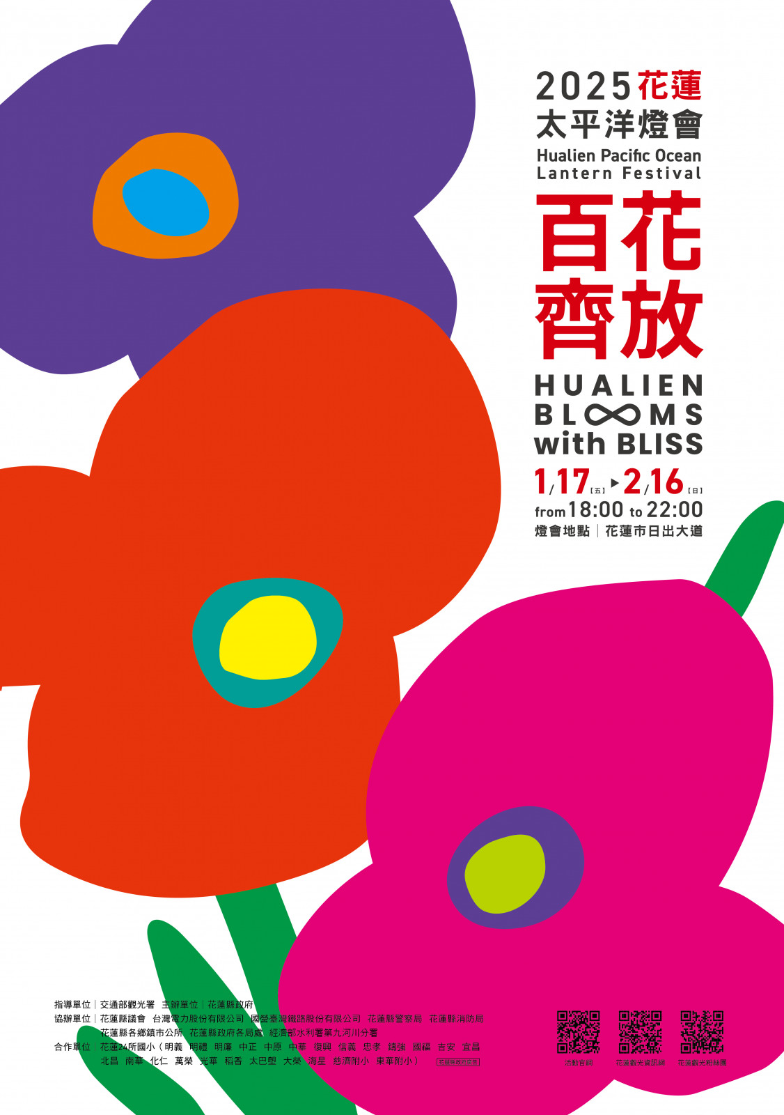 「2025花蓮太平洋燈會」將於1月17日至2月16日在花蓮市日出大道上盛大綻放,並將以「百花齊放」為主題,象徵花蓮歷經地震洗禮後綻放的生命力,更為2025「繁花盛開」的花蓮揭開序幕。燈會現場將以100朵超大花卉燈飾,分別匯集成10個花叢,隨著音樂律動展現出璀璨奪目的迎光盛宴,呈現花蓮十全十美、欣欣向榮的景象,更象徵著花蓮13鄉鎮市的韌性與32萬全體縣民的共同努力,讓這片土地再度「繁花盛開,百花齊放」,更張開雙手邀請全國鄉親與朋友,趁著農曆春節假期到訪花蓮LongStay,共同見證花蓮的重「心」綻放。