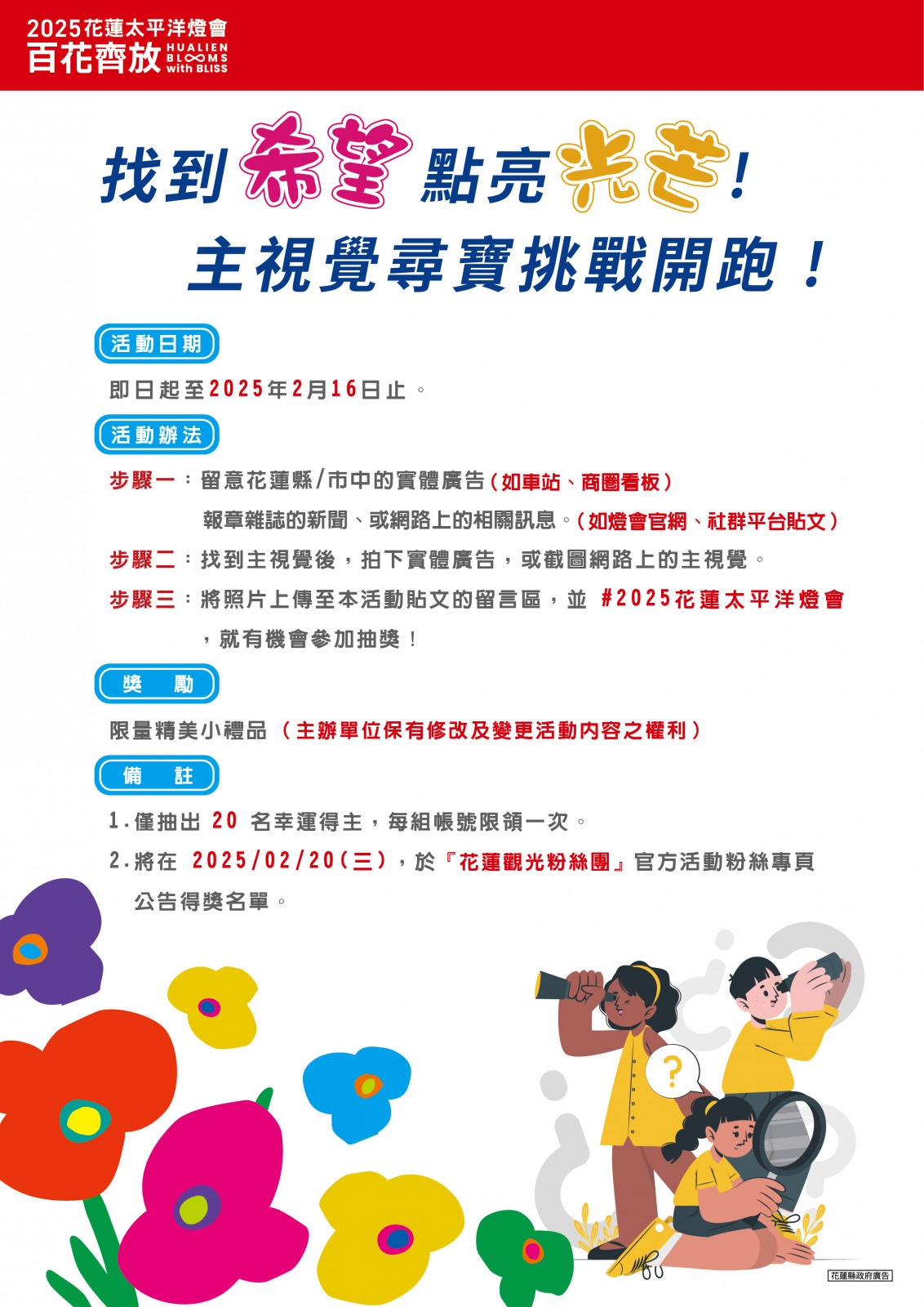 - 抽獎時間:將在2025年02月17日(一)下午14:00開始抽獎,並於『花蓮觀光粉絲團』官方活動粉絲專頁公告得獎名單,請獲獎民眾主動私訊本粉專獲得領獎資訊。